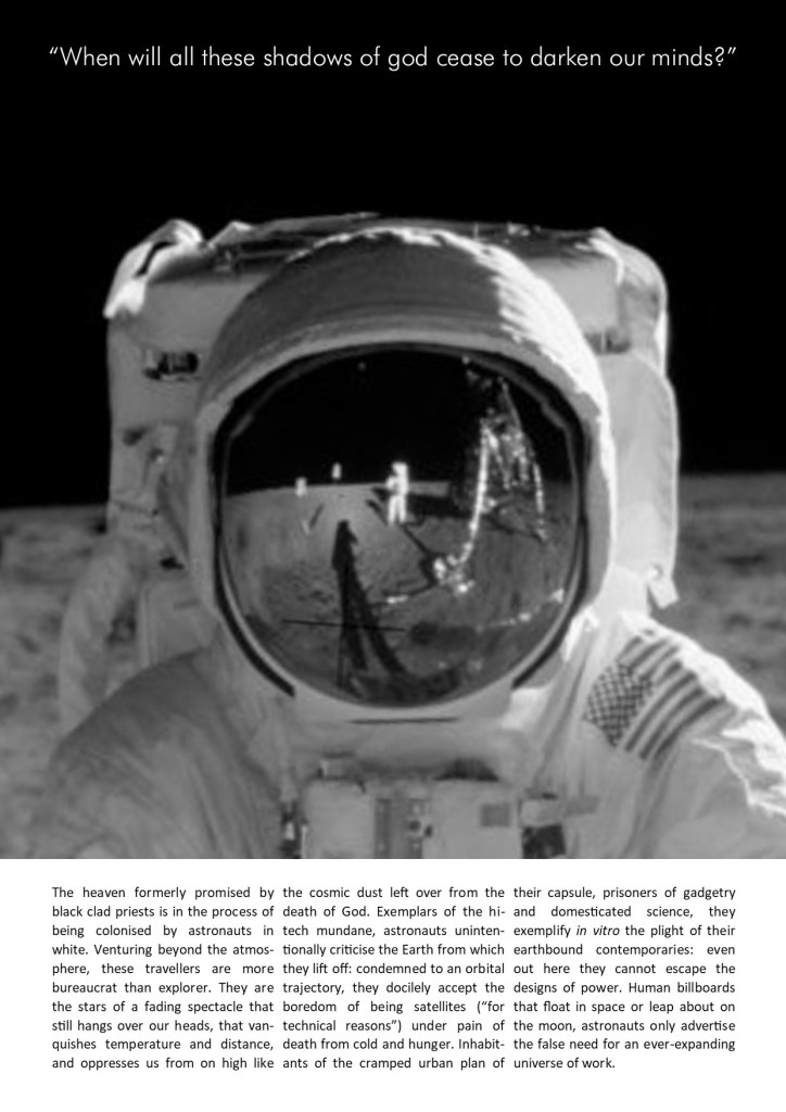 The “Conquest of the Cosmos” is the greatest spectacular expression of scientific oppression. […] The conquest of space is part of the planetary hope of an economic system which, saturated with commodities, spectacles and power, ejaculates into space when it arrives at the end of the noose of its terrestrial contradictions. Functioning as a new “America,” space must serve the states as a new territory for wars and colonies — a new territory to which to send producer-consumers and thus enable the system to break out of the planet’s limitations. […] But the revolutionary old mole, which is now gnawing at the foundations of the system, will destroy the barriers that separate science from the general knowledge that will be accessible to everyone when people finally begin making their own history. No more ideas of separate power, no more power of separate ideas. Generalized self-management of the permanent transformation of the world by the masses will make science a basic banality, and no longer a truth of state. […] Humanity will enter into space to make the universe the playground of the last revolt: the revolt that will go against the limitations imposed by nature. Once the walls have been smashed that now separate people from science, the conquest of space will no longer be an economic or military “promotional” gimmick, but the blossoming of human freedoms and fulfillments, attained by a race of gods. We will not enter into space as employees of an astronautic administration or as “volunteers” of a state project, but as masters without slaves reviewing their domains: the entire universe pillaged for the workers councils.